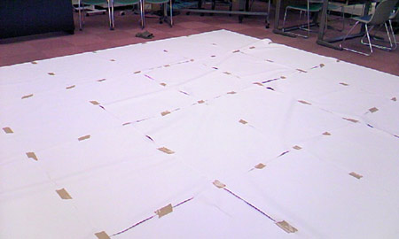 新聞紙(上は模造紙)を並べてガムテープでつなげるという